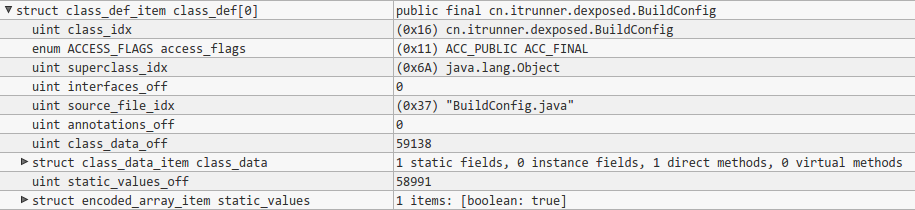 在dex文件中,class的索引区同样也定义在header中,分别为classDefsOff与classDefsSize,前者指向了class索引区的起始偏移量;在索引区中,同样也存在着classDefsSize个DexClassDef类型的指针数据,每一个数据都指向DATA区中的一个实体数据,其定义如下:1